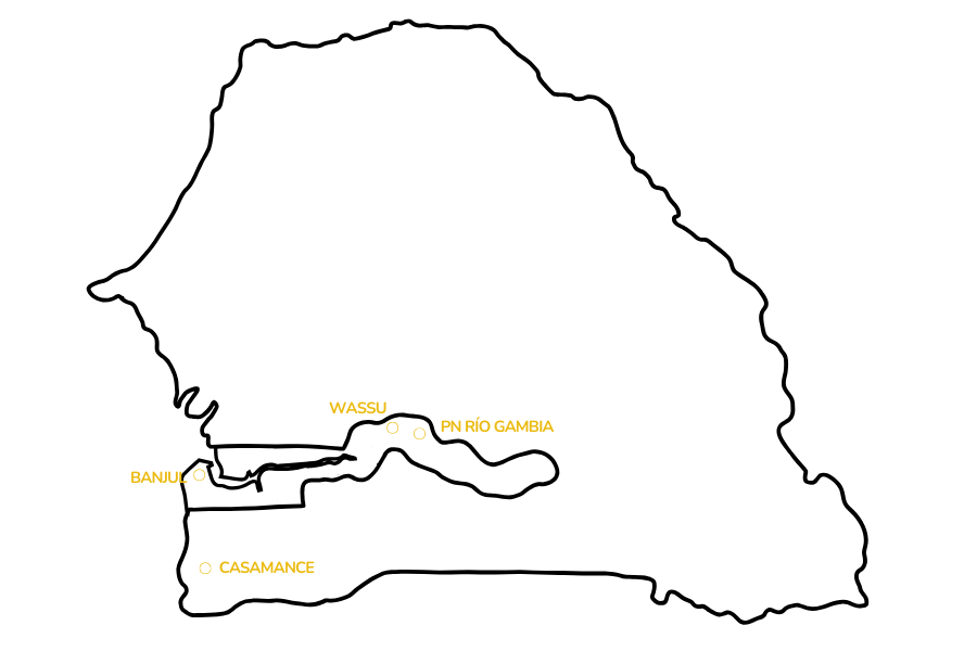 El viaje comienza en Serekunda, a las puertas de Banjul, donde la sonrisa gambiana nos recibe entre palmeras y aire cálido del Atlántico.